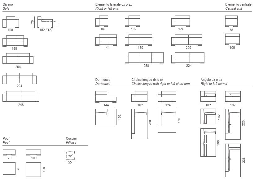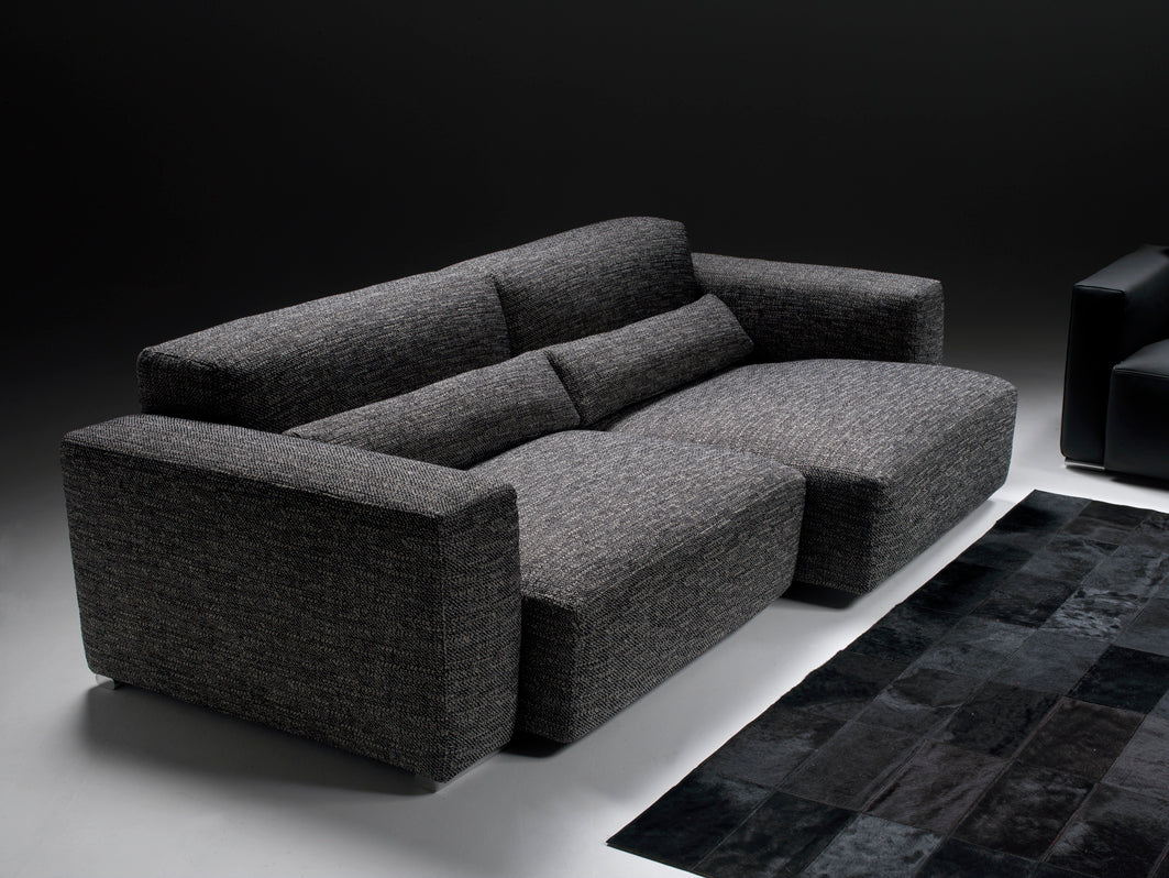 Hard wood structure covered in polyurethane with a protective fabric lining. Interwoven elastic webbing. Seat cushions in polyurethane covered with layer in feather. Back cushions in polyurethane and “memory form” covered with layer in feather. Oval Legs in aluminium or base in wood black lacquered. Completely removable fabric upholstery. Leather covering is fixed. Seat with relax system.