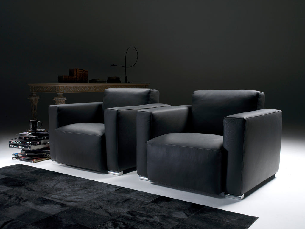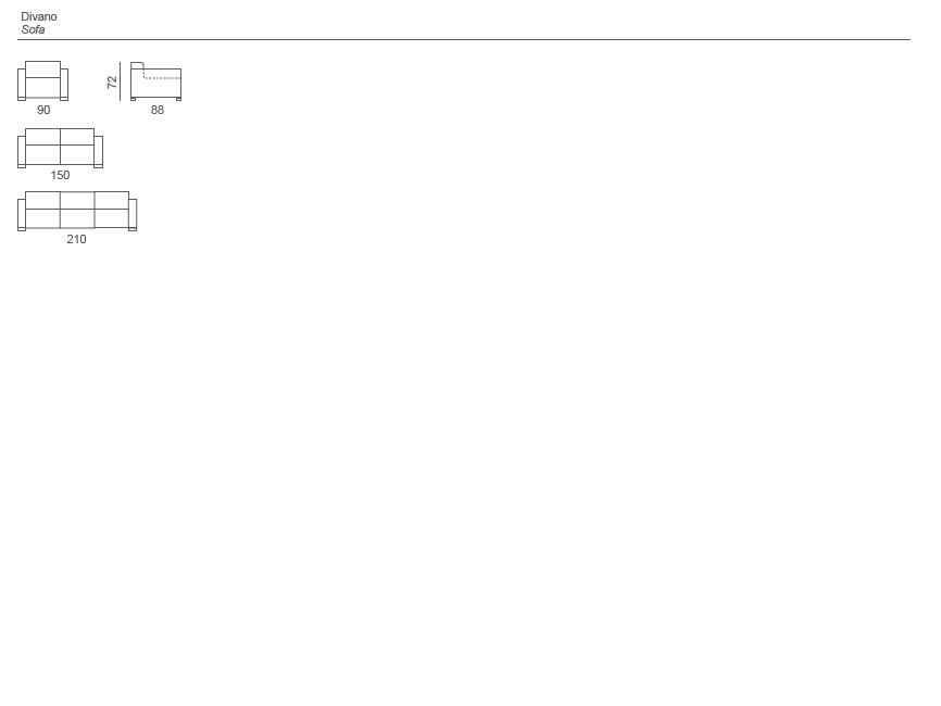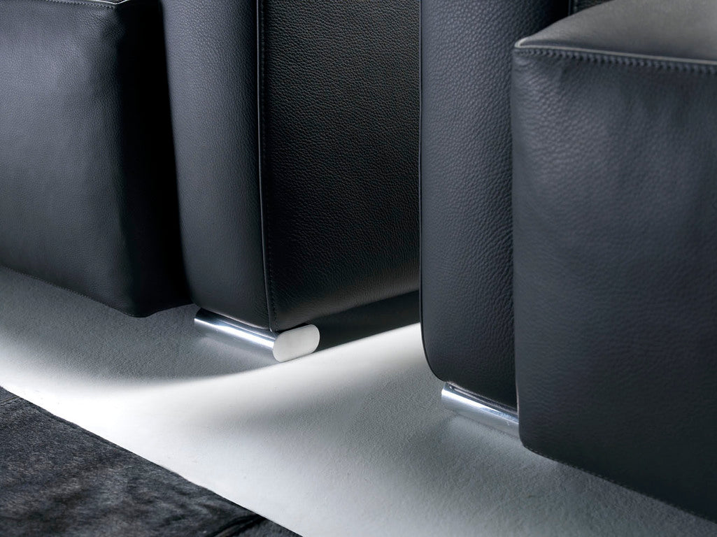 Hard wood structure covered in polyurethane with a protective fabric lining. Interwoven elastic webbing. Seat cushions in polyurethane covered with layer in feather. Back cushions in polyurethane and “memory form” covered with layer in feather. Oval Legs in aluminium or base in wood black lacquered. Completely removable fabric upholstery. Leather covering is fixed.