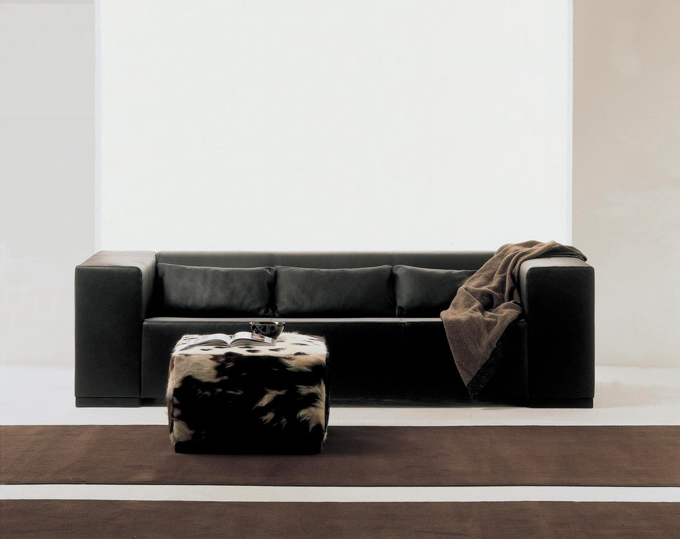 Hard wood structure covered in polyurethane with a protective fabric lining. Interwoven elastic webbing. Seat end back cushions in polyurethane and Dacron. Goose down back cushions. Legs in lacquered beech wood or in steel (mat or polished). Completely removable fabric upholstery.