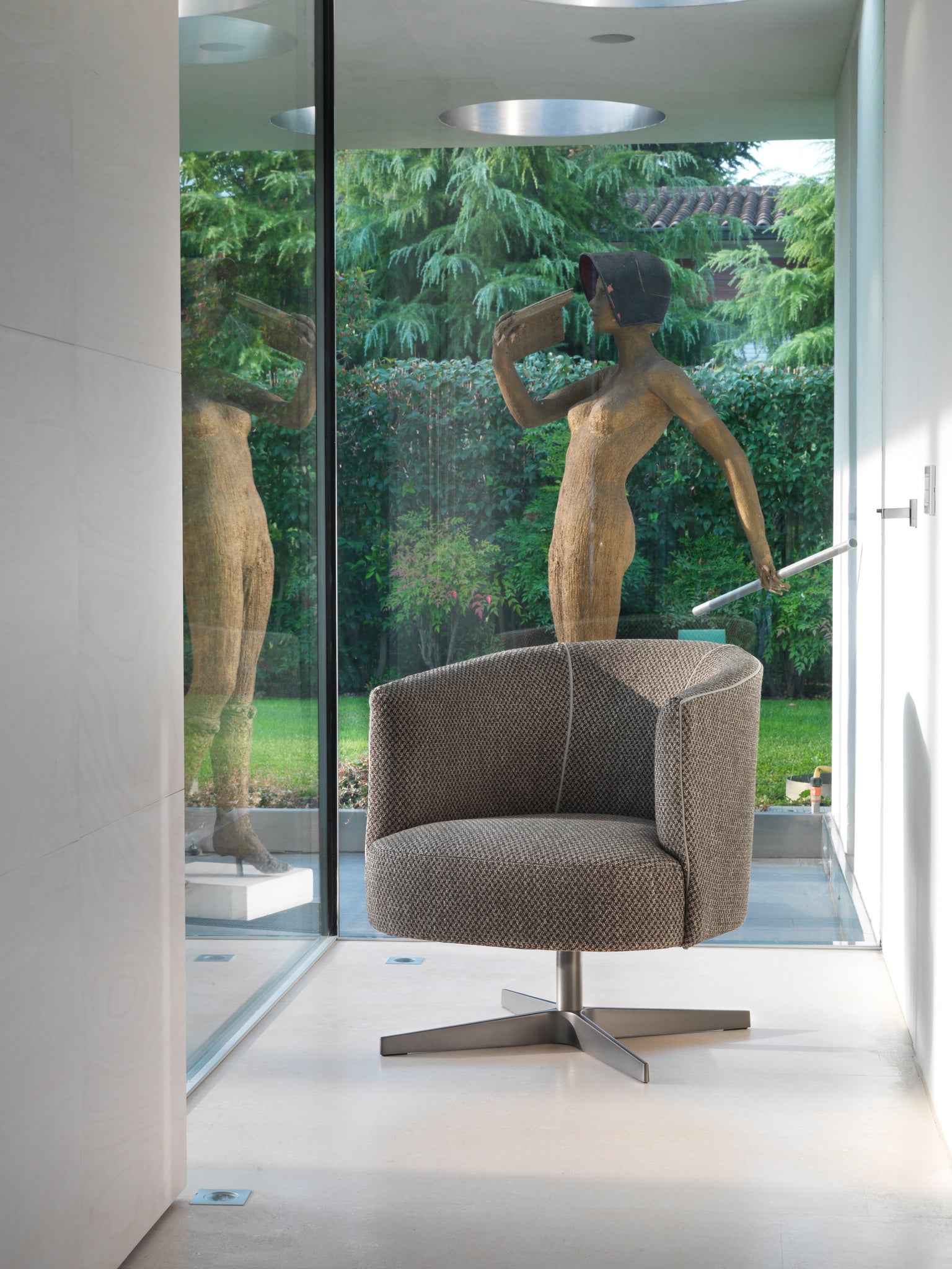Backrest structure in multilayer wood covered with polyurethane foam and coupled protective fabric. Seat frame in wood with elastic webbing covered with non-deformable polyurethane foam and “Memory foam”. Swivel base bronze or chrome finish. Fixed cover (not removable).