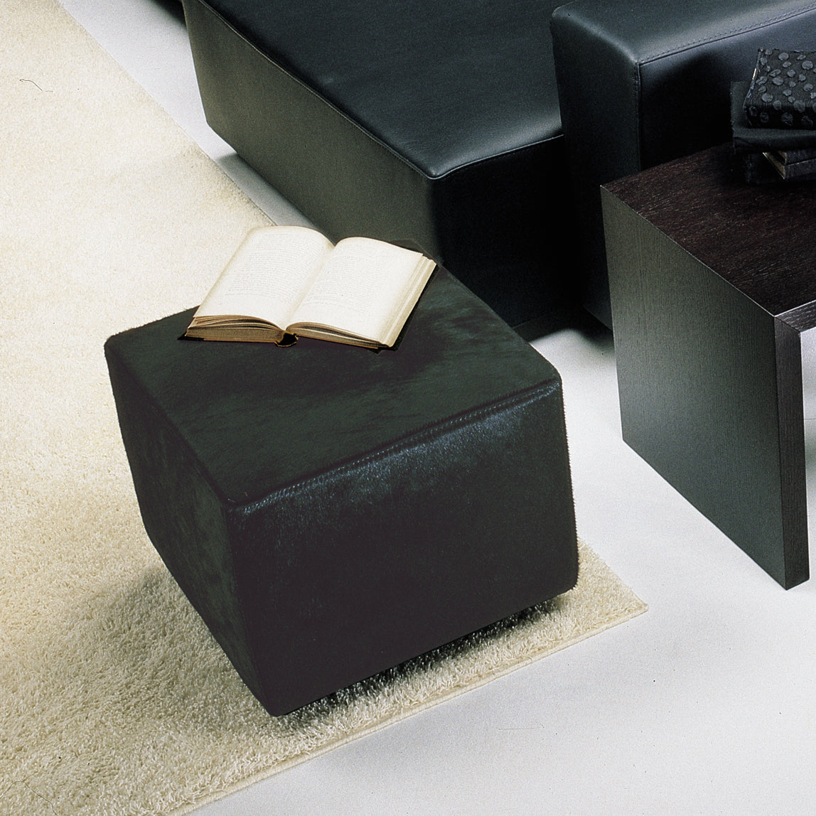 The Cubo footstool, measuring 42x42 cm, features dark brown Ponyskin leather upholstery and a hardwood frame coated with polyurethane for enhanced durability. Its protective fabric lining safeguards the structure, while the integrated wheels provide effortless mobility. The upholstery is fully removable, facilitating easy cleaning and maintenance, making this footstool a practical and elegant addition to any interior.