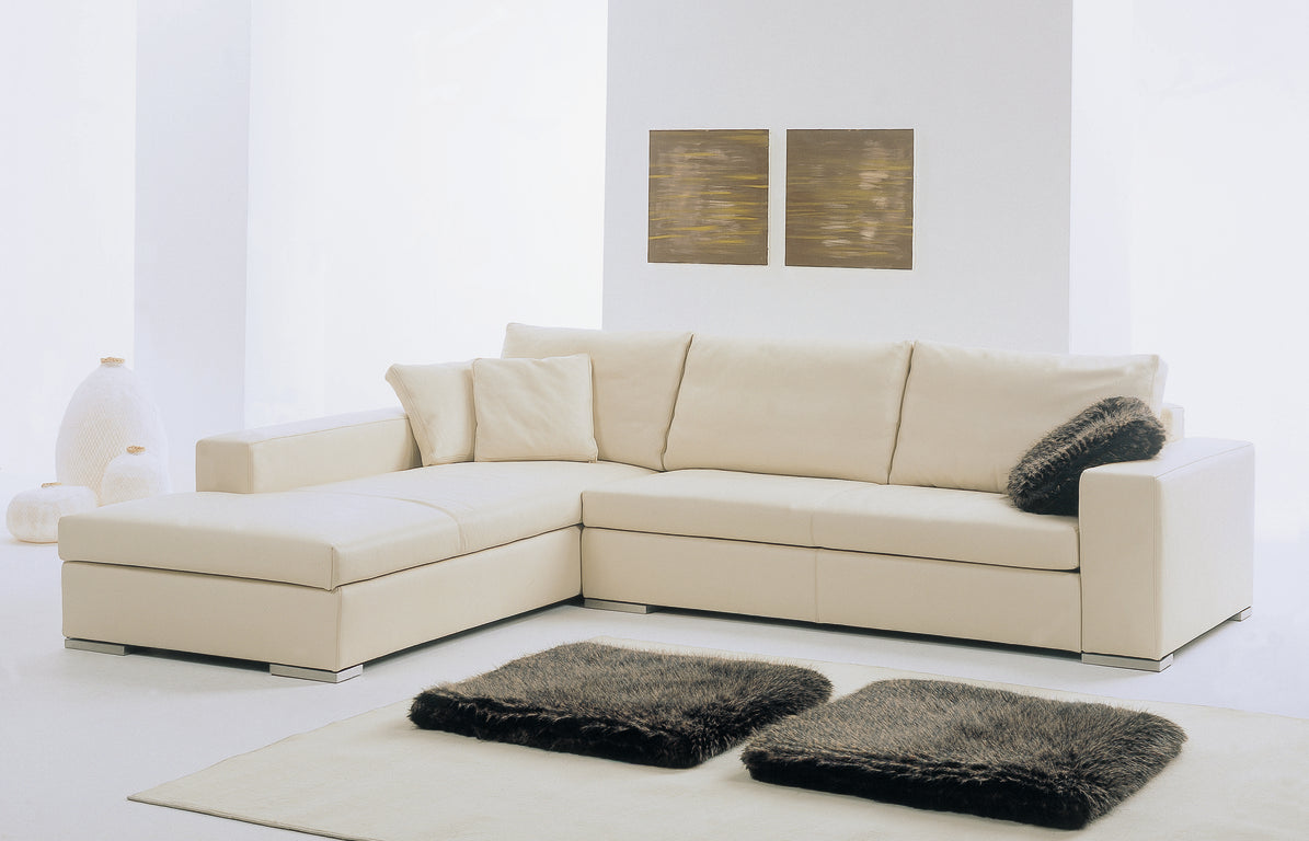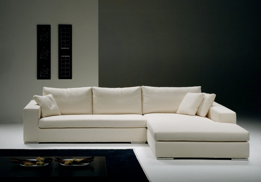 Domino is a versatile seating system designed for seamless integration into any space, offering clean lines and understated elegance. Available in two depths and multiple configurations—including linear sections, corners, chaise lounges, and ottomans—it delivers classic comfort through a hardwood frame with polyurethane padding and protective fabric lining. The interwoven elastic webbing enhances support, while seat cushions combine polyurethane and Dacron for durability. Back cushions feature a “Piumaroll” filling of goose down blended with 30% Dacron, complemented by loose goose down pillows. Legs are crafted from polished or matte steel. Fabric upholstery is fully removable; leather coverings are fixed.