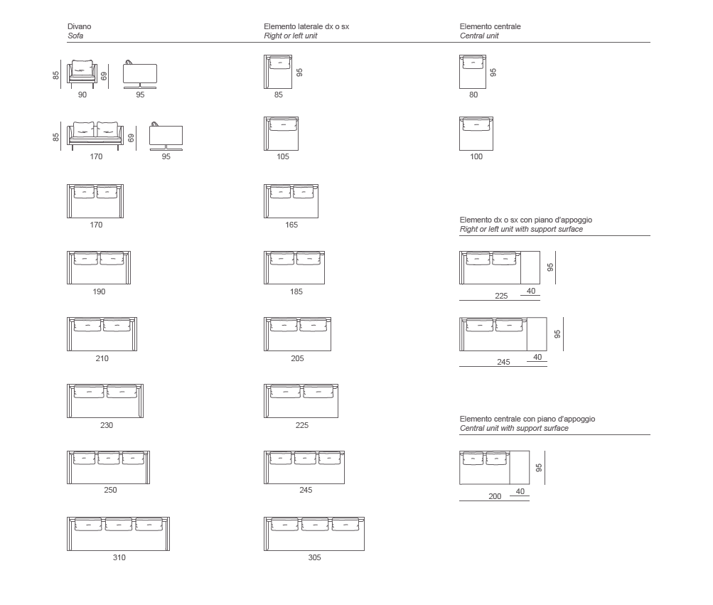 Wooden frame. Interwoven elastic webbing. Seat cushions in polyurethane with covering in goose down; back cushions in feather and polyester fiber mixture. Feet