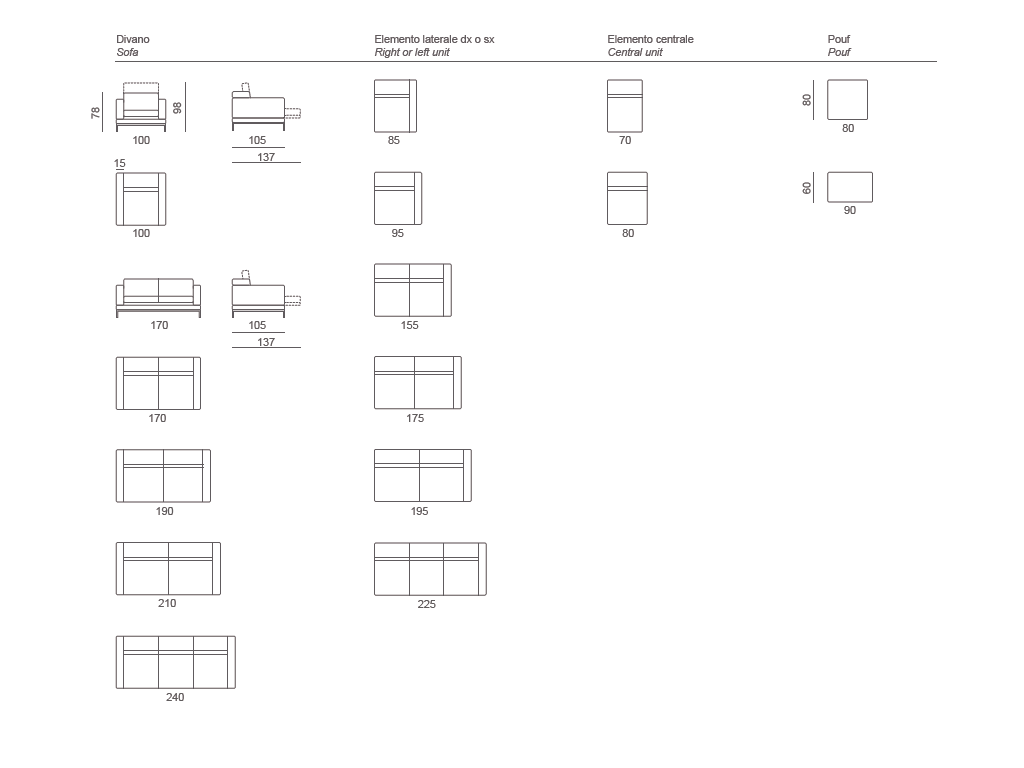 and Dacron. Back cushion polyurethane and feathers. Removable fabric upholstery. Leather covering is fixed. Seat with relax system that allows to reach 4 different