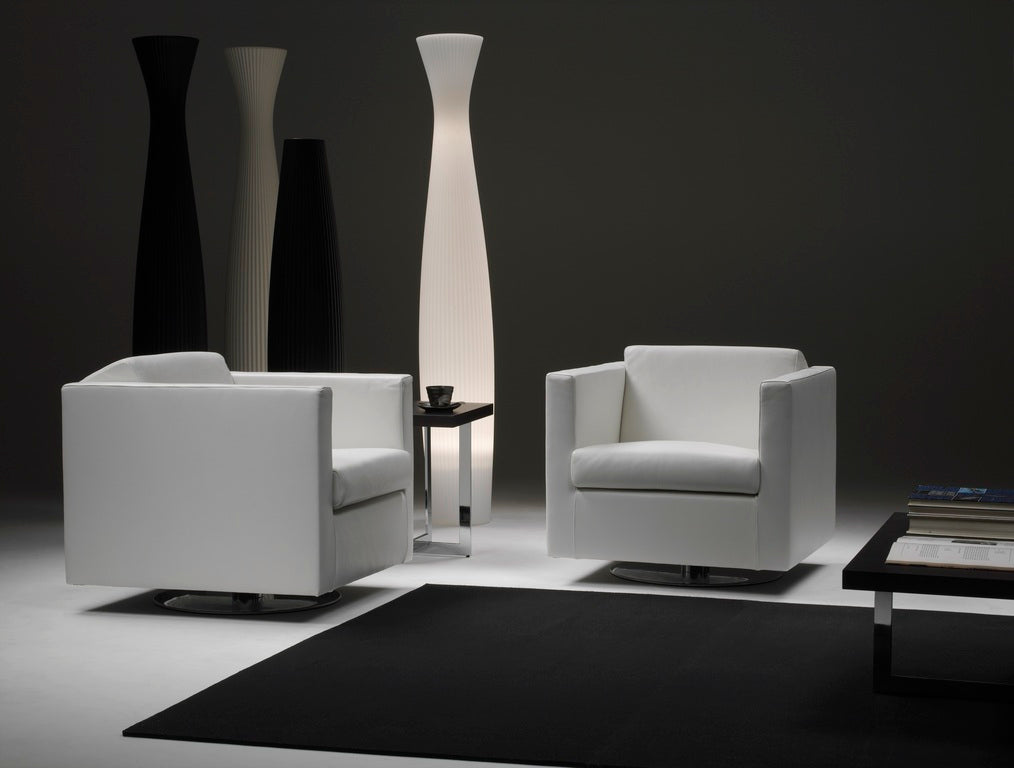 Hard wood structure covered in polyurethane with a protective fabric lining. Interwoven elastic webbing. Seat and back cushions in polyurethane and Dacron. Turning base chrome-plated or mat or aluminium legs (polished or mat);or in wooden legs. Completely removable fabric upholstery. Leather covering is fixed.