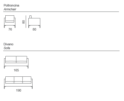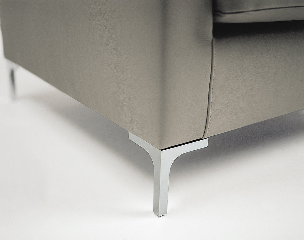 Hard wood structure covered in polyurethane with a protective fabric lining. Interwoven elastic webbing. Seat and back cushions in polyurethane and Dacron. Chrome plated metal legs or lama “L” leg in aluminium polished or mat. Completely removable fabric upholstery. Leather covering is fixed.
