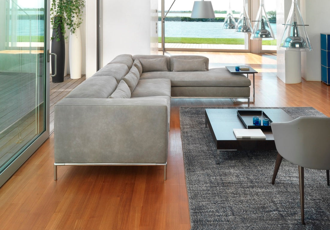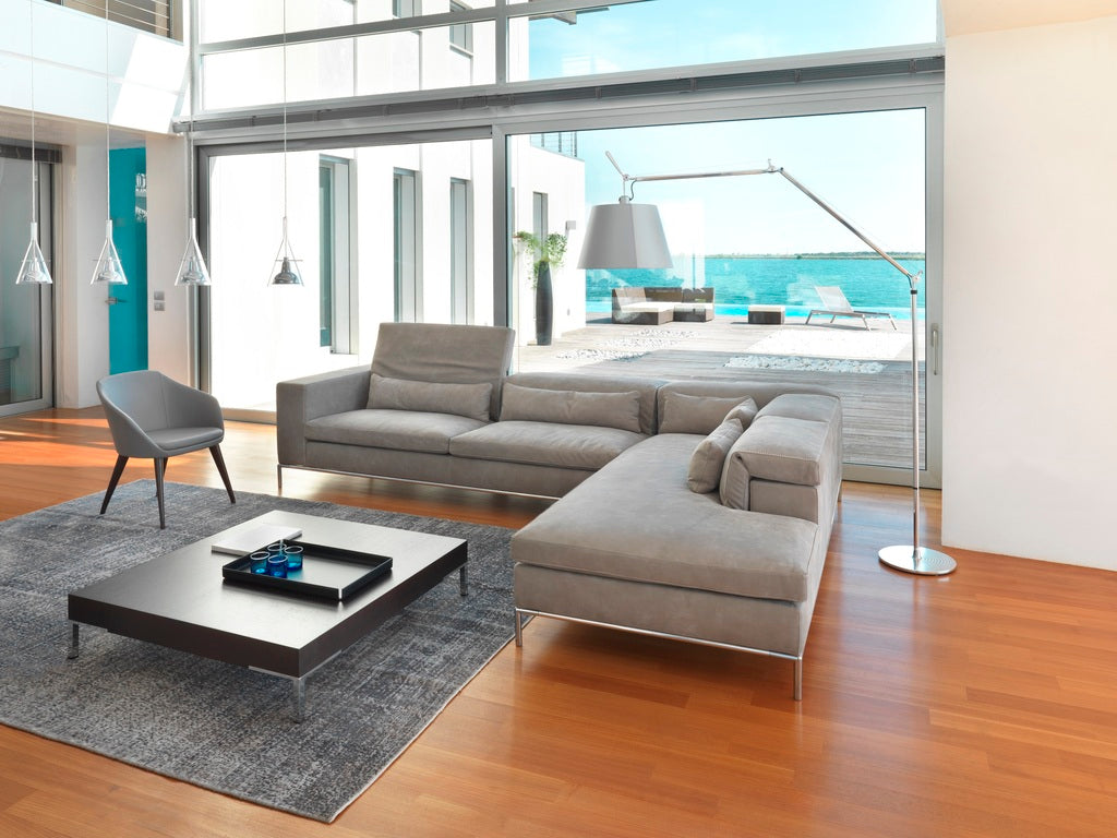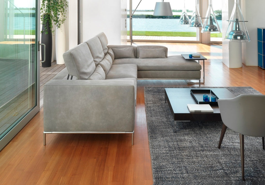 The Planet sofa combines geometric design with exceptional comfort, featuring reclining backrests adjustable to two positions for personalized support. Crafted with a sturdy hardwood frame and interwoven elastic webbing, it offers durability and resilience. Seat cushions blend polyurethane foam with a soft goose down cover, while back and kidney rest cushions provide plush support. The base is available in chrome or bronzed finishes, enhancing its refined look. Tailoring details like the “punto cavallo” stitching add a touch of sophistication. Fully removable fabric upholstery ensures easy maintenance and lasting elegance.