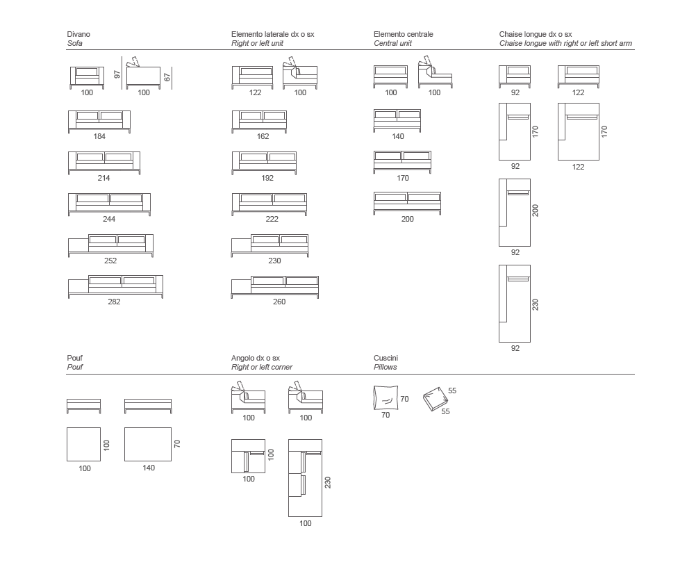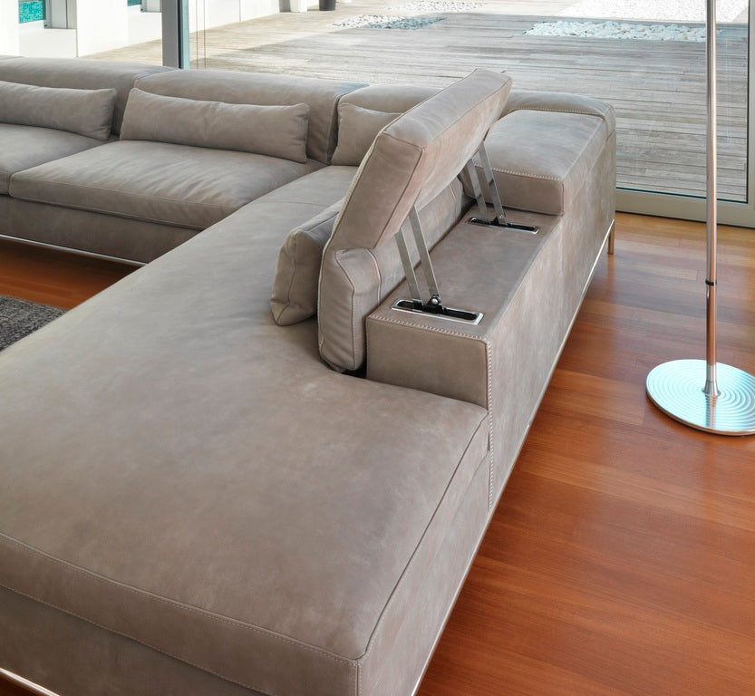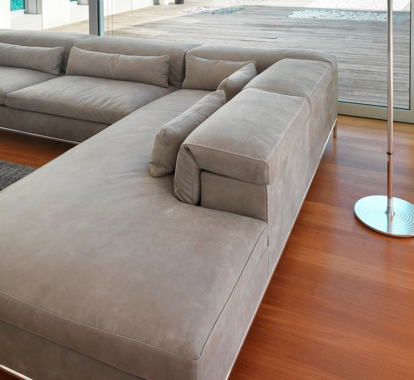 Hard wood structure. Interwoven elastic webbing. Seat cushions in polyurethane with covering in goose down; back cushions in polyurethane and goose down. Kidney rest cushion in down. Base chrome or bronzed finishing. Backrest are adjustable in two positions (high or low). On request stitching “punto cavallo”. Completely removable fabric upholstery.