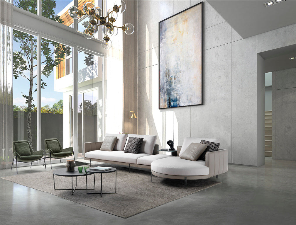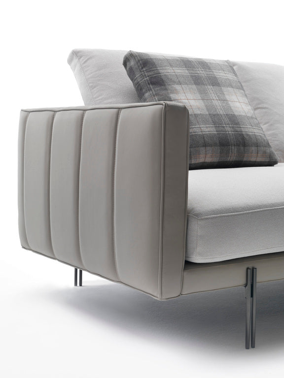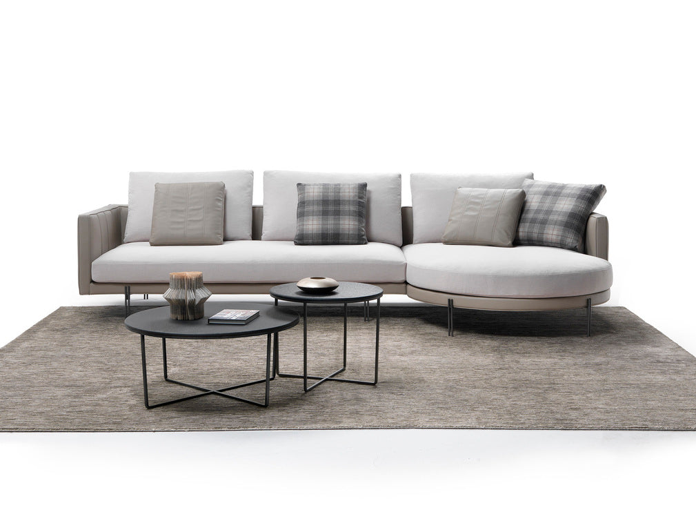 Poncho Angolare is a seating system defined by its airy design and clean, essential lines, embodying timeless elegance. Its distinctive vertical quilting with edged piping enhances each piece’s refined character. Crafted with a wooden frame and interwoven elastic webbing, it offers durable support. The seat cushions combine polyurethane and goose down for comfort, while back cushions blend feathers and polyester fiber for optimal relaxation. Metal-painted feet provide stability, and the fully removable fabric upholstery ensures easy maintenance. Available with chaise longues in linear or rounded shapes, it allows for versatile, original arrangements.