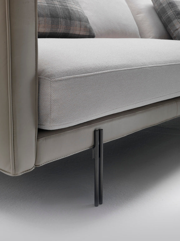 Wooden frame. Interwoven elastic webbing. Seat cushions in polyurethane with covering in goose down; back cushions in feather and polyester fiber mixture. Feet in painted metal. Completely removable fabric upholstery.