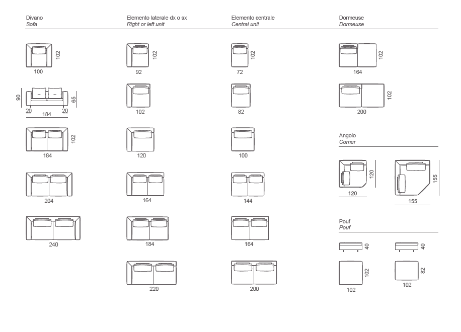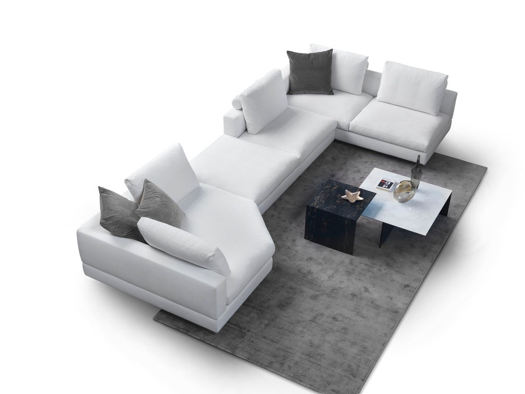 Hard wood structure covered in polyurethane with a protective fabric lining. Interwoven elastic webbing. Seat cushion in polyurethane and feather. Back pillows in feather and polyurethane mixture. Standard corner elements with back cushions without roll; all other items with roll. Feets in painted aluminum. Completely removable fabric cover. Frame leather cover is fixed.